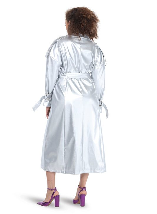 Love The Queen 17578 - Silver - Novelty Faux Leather Trench Coat with Belt