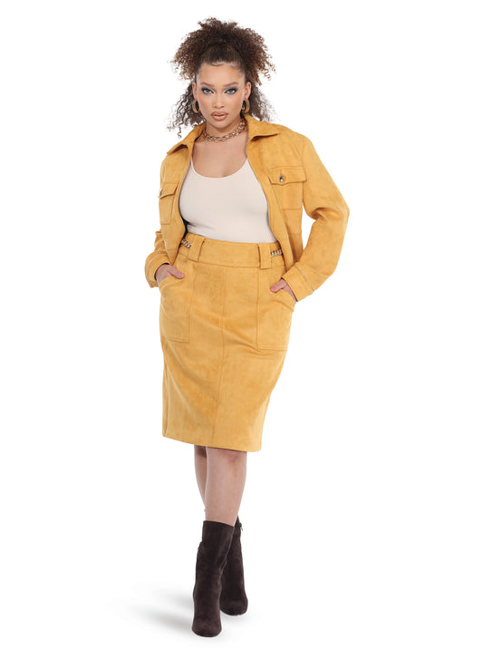 Love The Queen 17584 - Gold - 2 pc Faux Suede Zip Up Skirt Suit
