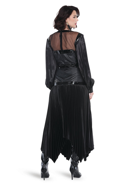 Love The Queen 17585 - Black - Faux Leather Dress with Pleated Skirt and Satin Crepe Sleeves
