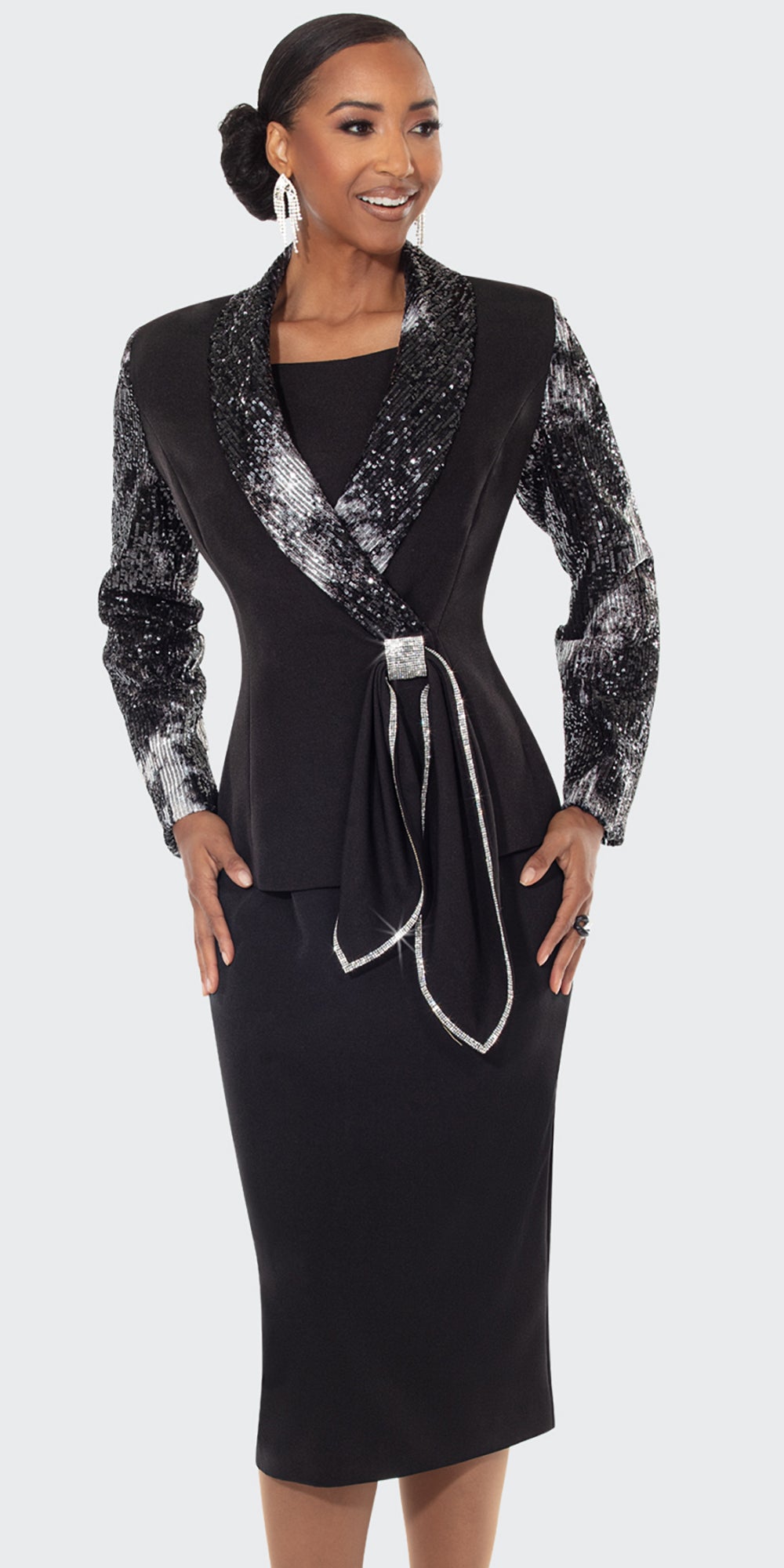 Elevate your wardrobe with the Donna Vinci 12213 Black Silver 2-piece Novelty Skirt Set. This expertly designed ensemble combines sleek black and shimmering silver tones for a sophisticated, modern look. Crafted to offer both style and comfort, the set is perfect for making a statement at special occasions or upscale events. Its unique design ensures versatility, allowing you to mix and match with other pieces for multiple outfit options. Experience refined elegance with this standout skirt set.