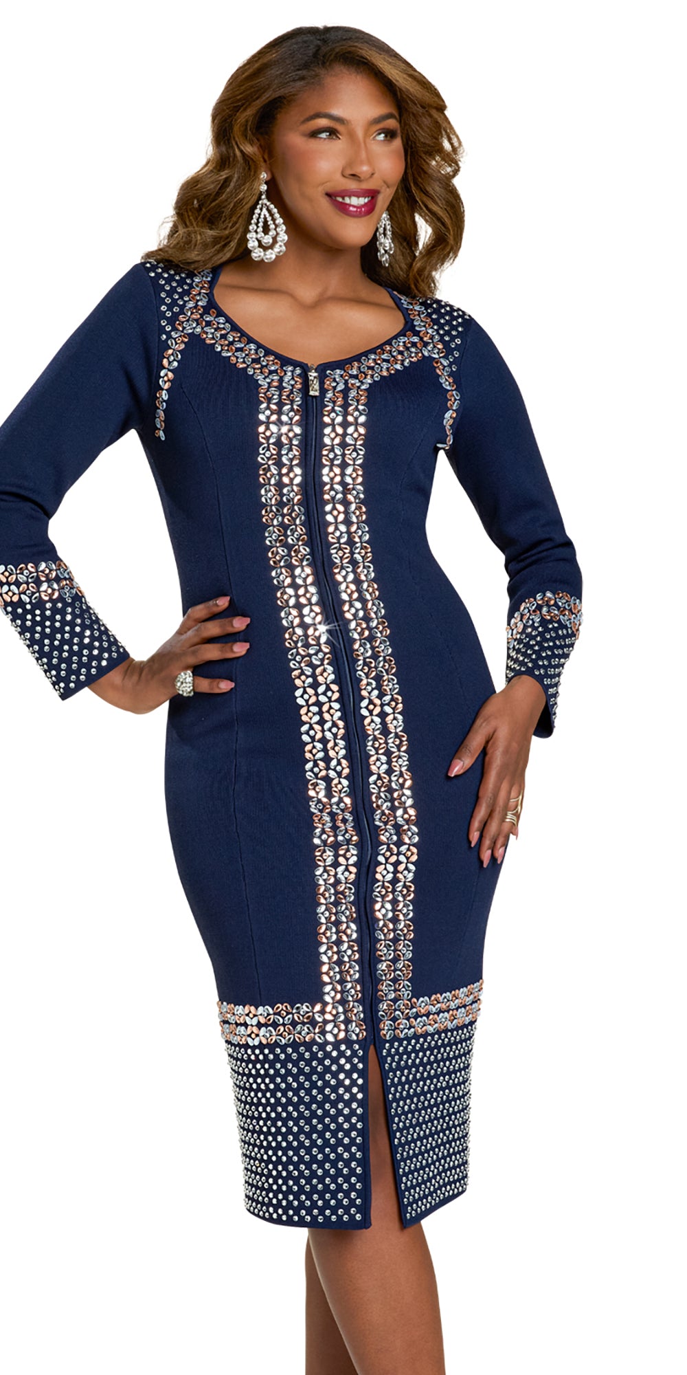 Elevate your evening wardrobe with the Donna Vinci 13449 Rhinestone Rose Gold Dress in navy. This expertly crafted gown features a sophisticated rose gold rhinestone embellishment that adds a refined sparkle, perfectly complementing the deep navy fabric. Designed for elegance and comfort, it offers a flattering silhouette ideal for formal occasions. The combination of luxurious materials and meticulous detailing ensures you stand out with timeless style and grace.